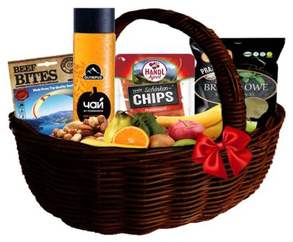 В кошницата сме поставили: Протеинов чипс от месо Handl Tyrol шунка 40гр, Сушено говеждо месо Beef Bites Original Bullseye Meats 50гр, Снакс с броколи и морска сол La Esmera GMO & Gluten Free 100гр, Печени ядки Микс 250 гр - лешници, бадеми, кашу, шам фъстък, Микс от плодове за подаръчна кошница 2кг, Планински чай Olympus Праскова 500мл, Поздравителна картичка.