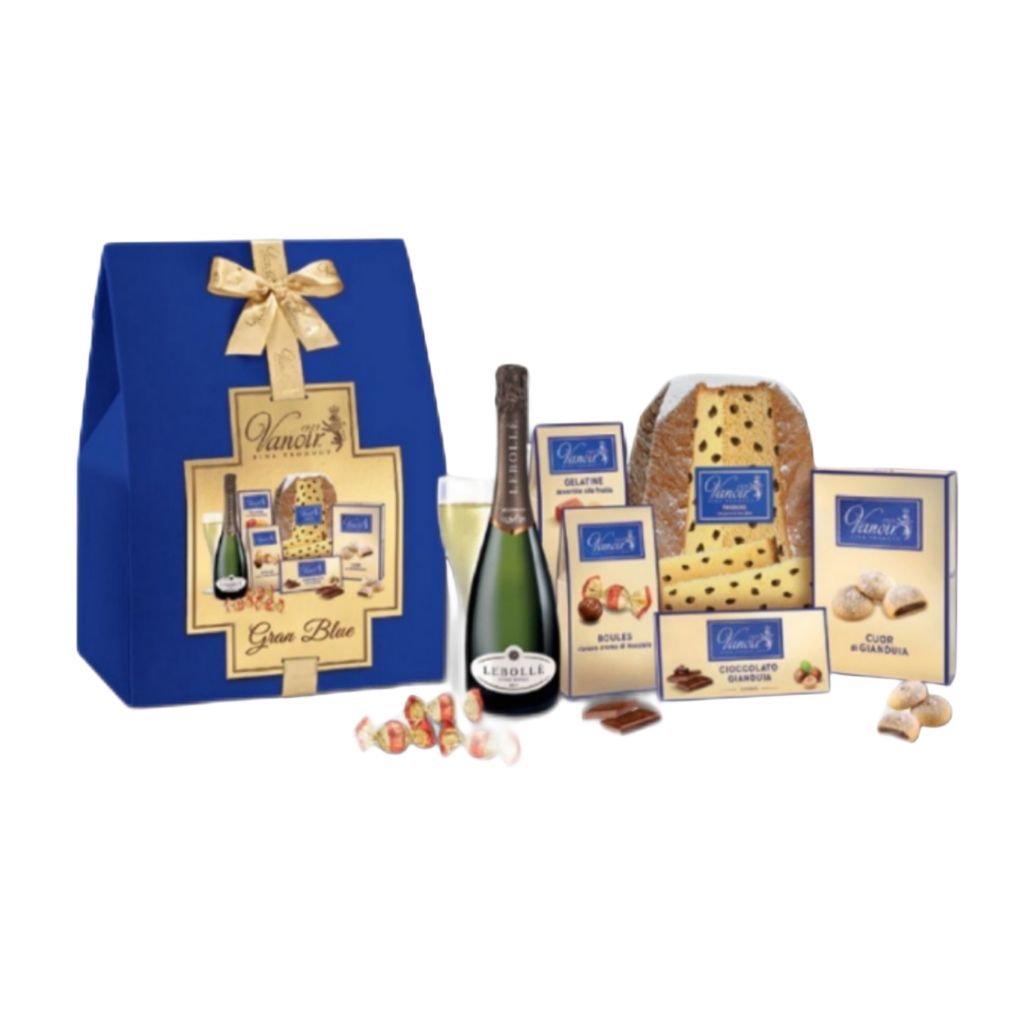 Pandoro Vanoir 750g Пастичини с крем джандуя Vanoir 140g Пралини с лешников крем Vanoir 100g Шоколад с крем джандуя Vanoir 100g Желирани плодови бонбони Vanoir 100g Пенливо вино Millesimato Brut Le Bolle 11%, 750ml