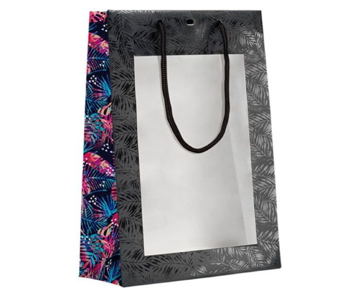 Подаръчна Торбичка Черна с Тропически Печат и PVC Прозорец 20х10х29 см