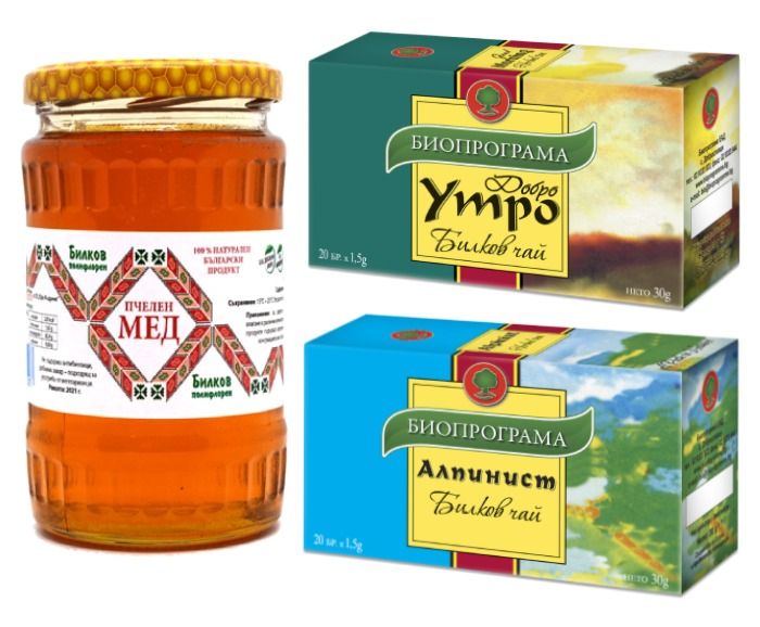 Пакет: Пчелен Мед Билков Еко Ферма Черга 400 г + Чай Биопрограма 2 x 20 бр Добро утро + Алпинист