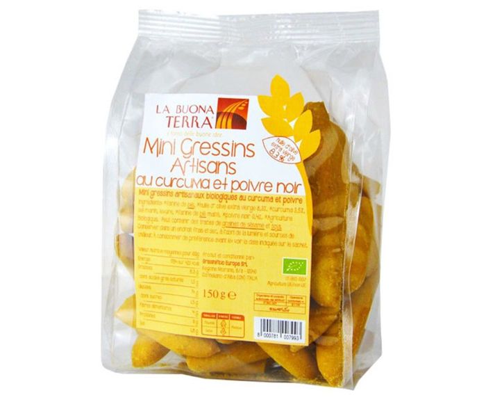Пшенично брашно*, маслиново масло extra virgin* 8.3%, куркума* 3.5%, морска сол, мая, малцово пшенично брашно*, черен пипер* 0.4%,*от контролирано БИО производство, може да съдържа следи от сусам и соя
