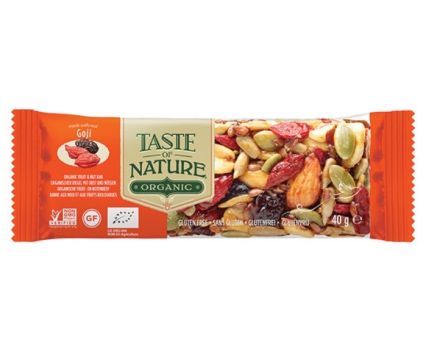 Стафиди* (20%) (стафиди*, слънчогледово олио*), печени ФЪСТЪЦИ* (19%), сироп агаве*, слънчогледови семена* (10%), КАШУ* (8%), плодове годжи* (6%), ленено семе* (6%), сироп от кафяв ориз*, БАДЕМИ* (5%), тиквени семена* (5%), слънчогледово олио смес* (слънчогледово олио*, антиоксиданти: смес от токофероли, екстракт от розмарин*), сок от нар концентрат*, лиофилизирани малини на парчета*, сгъстител: агар. *от контролирано био производство , може да съдържа други ЯДКИ, СУСАМ, СОЯ. Може да съдържа костилки и черупки.