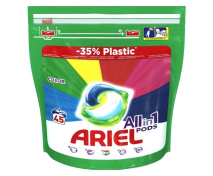 Перилен препарат Ariel Color под формата на концентриран гел в капсули. Има специален покривен слой, който се разтваря напълно при контакт с вода и освобождава силата на супер технологията за отстраняване на замърсявания. Почиства, премахва петната и прави дрехите искрящо чисти.