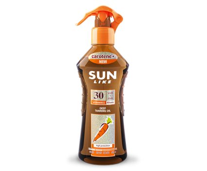 Sun Like е слънцезащитно спрей масло за интензивен бронзов загар с удобна помпа. Има UVA и UVB филтри за надеждна защита от слънчевите лъчи, формула обогатена с Витамин Е и Beta Carotene за бърз, равномерен и дълготраен тен. Не изсушава, а хидратира кожата в дълбочина, като се грижи за еластичността на епидермиса. След употребата им ще се радвате на здрава кожа, нежно целуната от слънцето. Придобиването на здравословен и бърз тен никога не е било толкова лесно. Радвайте се на пълноценна релаксация на плажа и оставете невероятният аромат на маслата да ви отпусне. С фактор SPF 30 за висока защита.