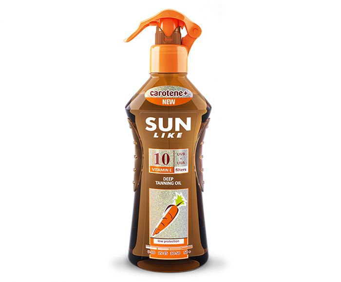 Sun Like слънцезащитно спрей масло за интензивен бронзов загар Sun Like с удобна помпа. С UVA и UVB филтри за надеждна защита от слънчевите лъчи, Формула обогатена с Витамин Е и Beta Carotene за бърз, равномерен и дълготраен тен. Продуктът не изсушава, а хидратира кожата в дълбочина, като се грижи за еластичността на епидермиса. След употребата им ще се радвате на здрава кожа, нежно целуната от слънцето. Придобиването на здравословен и бърз тен никога не е било толкова лесно. Отдайте се на пълноценна релаксация на плажа и оставете невероятният аромат на маслата да ви отпусне. С фактор SPF 10 за ниска защита.