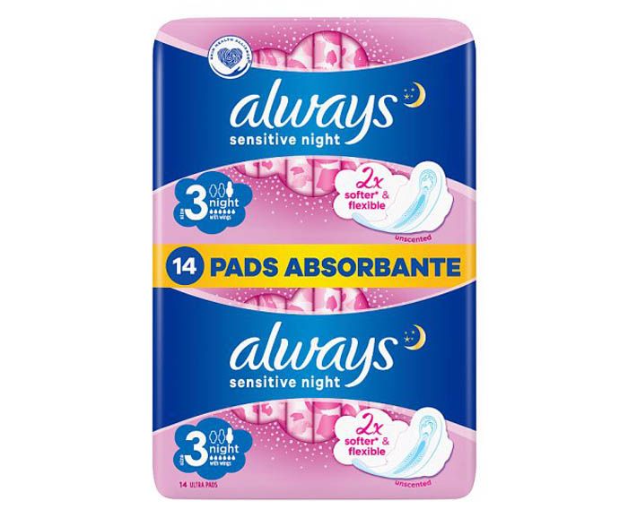 С мек като памук покриващ слой и удобство за всички зони, осигуряват допълнителен комфорт за вашата деликатна кожа през нощта. Идеални за през нощта или за вашите най-тежки дни на менструалния цикъл. С крилца, които осигуряват допълнителна странична защита. Санитарните памучни кърпи Always Sensitive Ultra Night (размер 3) с най-добрите санитарни кърпи за безгрижни нощи.