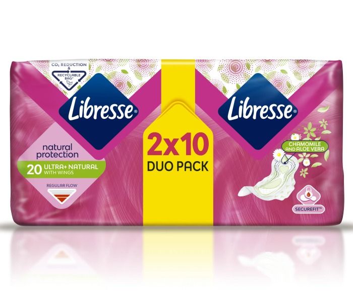 Libresse Ultra Natural съдържат екстракти от алое вера и лайка. Техните антиалергични и антисептични свойства предпазват кожата от възпаления и раздразнения. Превръзките са тънки и меки, с деликатна дишаща повърхност, която предпазва от раздразнения и неприятни миризми. Създадени по технологията SecureFit™- по-широки в предната и задната част на превръзката - повече абсорбираща площ и сигурност от протичане. Подходящи за чувствителна кожа, благодарение на добавените натурални екстракти от Алое вера и лайка.