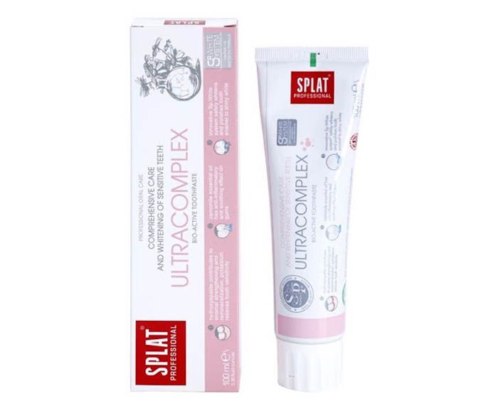 Splat Professional Ultracomplex Toothpaste е мултиактивна паста за чувствителни зъби, която стяга венците и има противовъзпалително действие. Добавените в състава цинкови и калиеви йони намаляват чувствителността на зъбите, а екстрактът от лайка действа противовъзпалително. Пастата избелва и полира зъбите. След редовна употребата чувствителността на зъбите е намалена, емайла - укрепен, усмивката - бяла, а дъхът свеж. Не съдържа флуор.