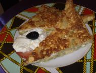 Измийте добре и почистете тиквичките. Нарежете ги на колелца с дебелина около 1 см., след което нарежете всяко колелце на 4 части. Поставете ги в голяма, предварително намазнена тава, след което ги поръсете с нарязания копър, черен пипер, сол и натрошеното сирене. Добавете зехтина и разбъркайте добре. Поставете тавата в предварително силно загрята фурна 220-240 С и с периодични разбърквания запечете тиквичките за около 30 мин. В голяма купа разбийте яйцата, двата вида брашно и прясното мляко (най-добре се получава в кухненски робот). Настържете на едро ренде кашкавала. Извадете тиквичките от фурната, наръсете отгоре кашкавала и залейте обилно със сместа от яйца, мляко и брашно. Запечете на вече по-слаба фурна за около 20 минути или докато се зачерви добре. Ястието идеално се гарнира със сладка горчица или с кисело мляко. Bon Appetit!