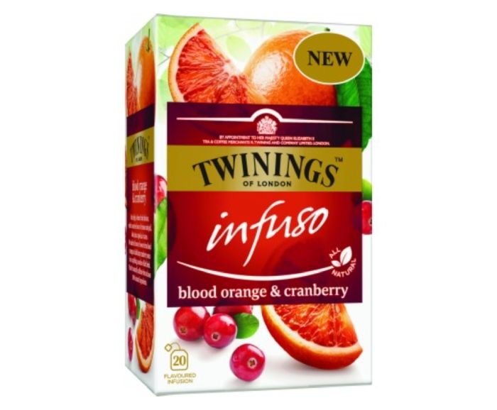 Twinings Infuso с изкушаващи плодови вкусове на червен портокал, червена боровинка и аромати от нар - само естествени съставки. Без захар и без кофеин.