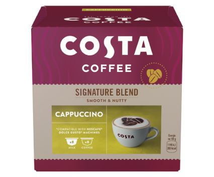Елегантно капучино от Costa Coffee, перфектно съчетание от фино еспресо и копринено мляко. Еспресото е бленд от бавно изпечени зърна деликатна арабика и силни робуста, с разкошен аромат на бисквитки и печени ядки. Отдайте се на идеалното капучино, с което да освежите деня си!