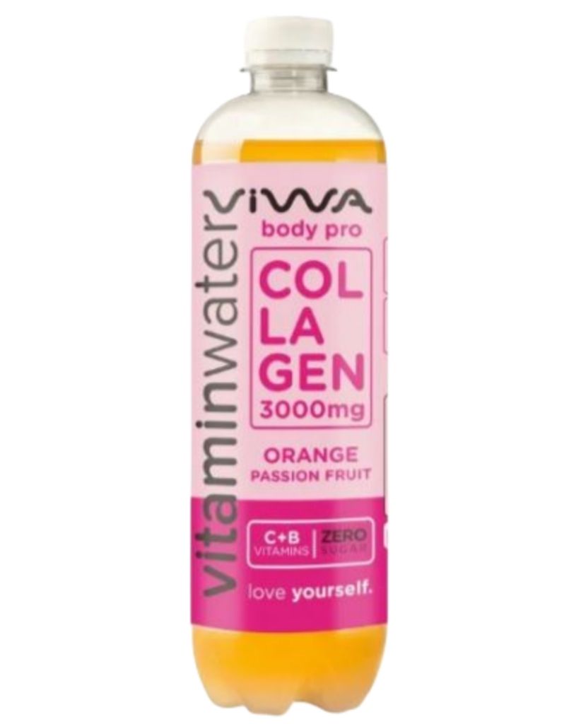 VIWA BODY PRO COLAGEN Вива Боди Про Колаген витаминна вода с колаген, цинк, витамини C и B. Произведена с висококачествени, естествени съставки с освежаващ вкус на портокал и маракуя. Подсладена със стевия и сукралоза, без рафинирана захар. Витамините от група B подпомагат енергийния метаболизъм, когнитивната функция и съдействат за поддържане здравето на кожата, косата и очите. Подпомагат сърдечно-съдовата система, засилват метаболизма и енергията. Колагена подобрява състоянието на костите, кожата, косата и ноктите. Цинкът поддържа имунната система.