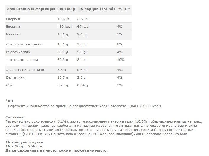 Пълномаслено сухо мляко (46,1%), захар, нискомаслено какао на прах (10,5%), обезмаслено мляко на прах, аромати, минерали (калциев карбонат и магнезиев карбонат), лактоза, напълно хидрогенирана растителна мазнина (кокосова), сгъстител (карбокси метил целулоза), емулгатор (соев лецитин), сол, екстракт от мая, витамини (С, В1, Ниацин, Пантотенова киселина, В6, Фолиева киселина), слънчоледово масло, канела