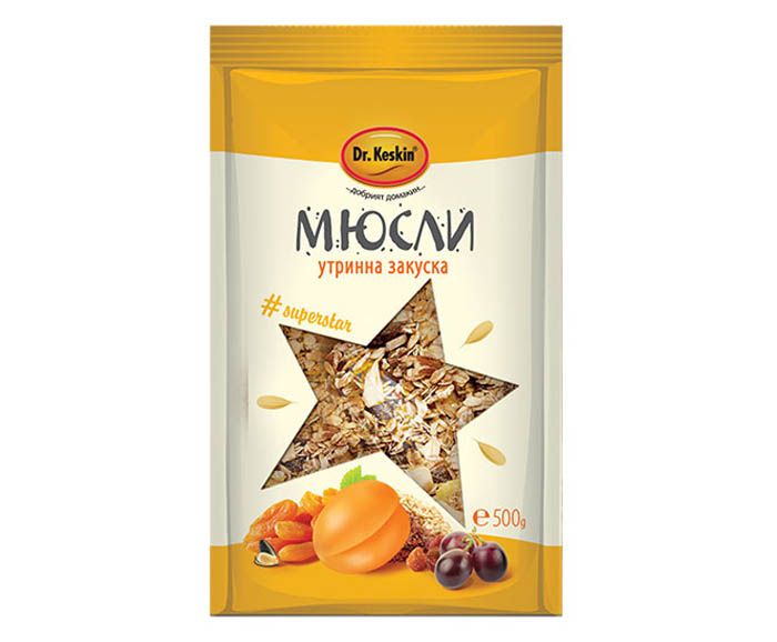 Пълнозърнести ядки (овесени, пшенични, ръжени); корнфлейкс; стафиди (сушено грозде); белен слънчоглед, ленено семе, белен сусам; нарязани сушени плодове: кайсии, ябълки, фурми, смокини, сини сливи. Указания за употреба: Консумира се с прясно или кисело мляко, плодов сок, нектар и др.