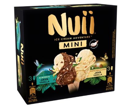 Java ванилов сладолед, покрит с бял шоколад (34%) и парченца печени бадеми (5,5%): възстановено обезмаслено мляко, захар, сметана (от мляко) (13,5%), какаово масло¹, пълномаслено мляко на прах, глюкозен сироп, парченца печен бадем, обезмаслено мляко на прах, емулгатори (моно- и диглицериди на мастни киселини, соев лецитин, Е476), стабилизатори (гума гуар, гума локуст бийн), концентрат от морков, естествен ароматизант ванилия от Ява, извлек и смлени Ява шушулки ванилия, екстракт от ванилия. ¹ Сертифицирано Rainforest Alliance. Може да съдържа фъстъци, други ядки и яйца.