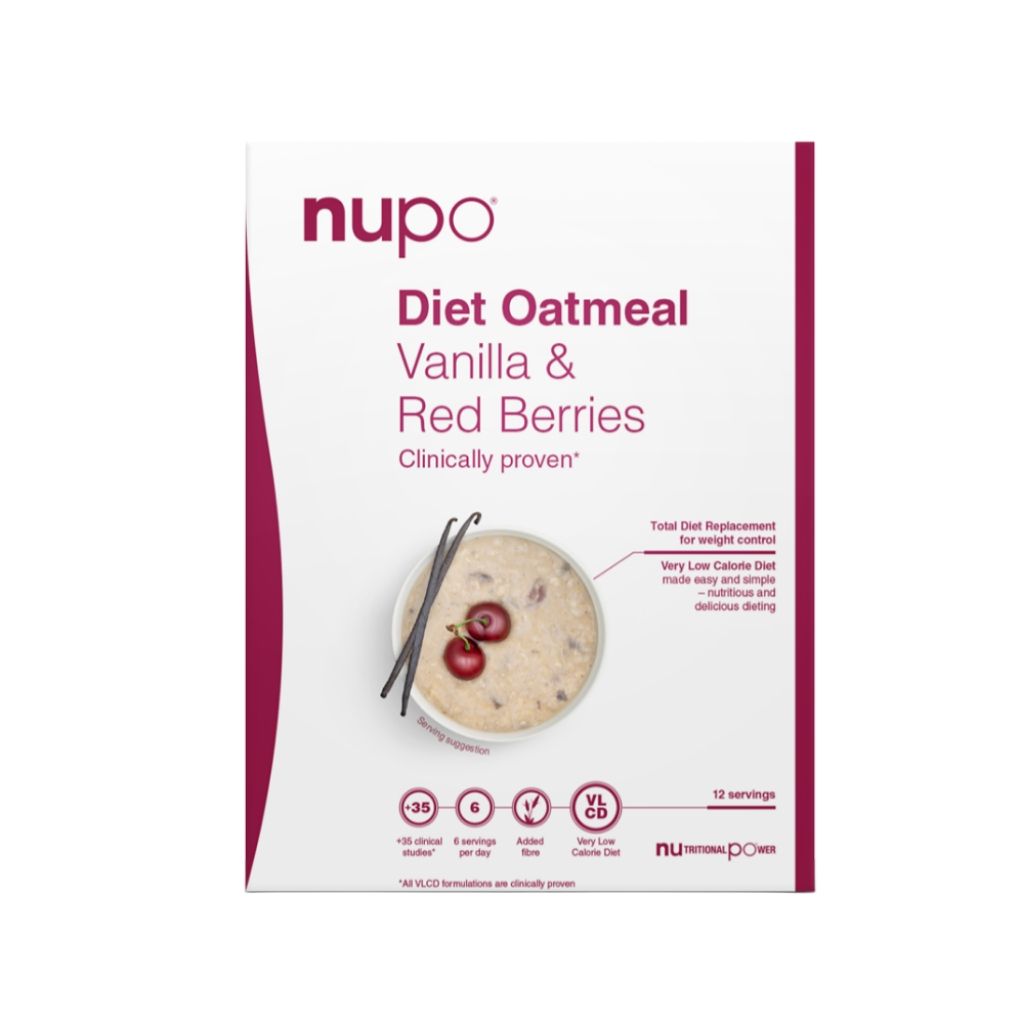 Пълен заместител на хранене за контрол на теглото с много ниско съдържание на калории (VLCD) и вкус на овесени ядки с ванилия и червени плодове. Съдържа подсладител.