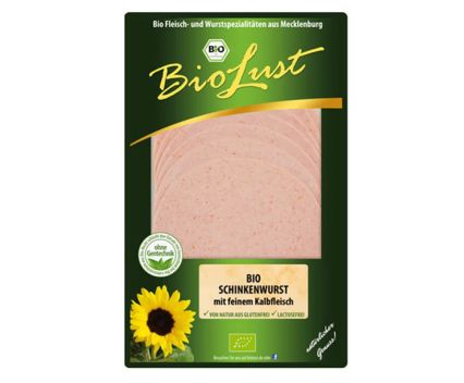 свинско месо* (53%), питейна вода, бекон*, телешко месо* (10%), готварска сол, подправки* (съдържат синап), регулатор на киселинността: тринатриев цитрат, малтодекстрин*, антиоксидант: аскорбинова киселина, консервант: натриев нитрит. * от контролирано биологично производство. Опаковано в защитна атмосфера. Натурално без глутен и лактоза.