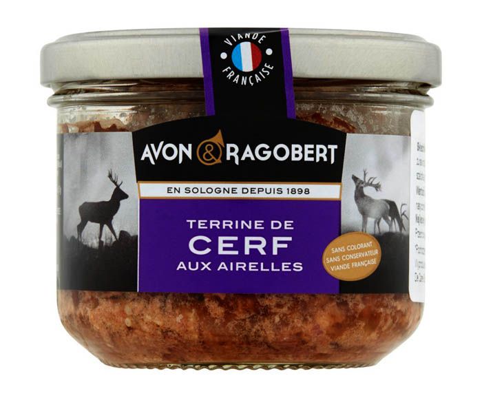 еленско месо 30%, свинско месо, свински черен дроб, свинска мас, червени боровинки, коняк, пшенично брашно, сол, подправки, млечни протеини, яйца, мляко. Не съдържа оцветители и консерванти. Произведено в среда, която може да съдържа ядки.
