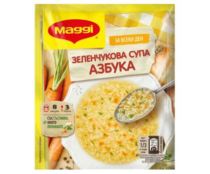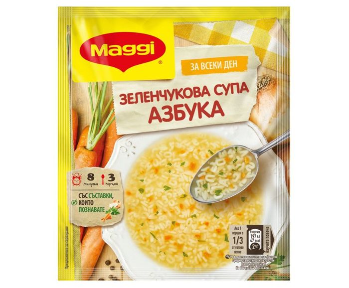 Макаронени изделия 65,9% (пшеничено брашно, яйца на прах), сол 11,6%, изсушени зеленчуци (лук 2,5%, моркови 2,4%), царевично нишесте, картофено нишесте,захар, екстракти от мая, слънчогледово масло, естествени ароматизанти, подправки (листенца магданоз 0,7%, куркума, черен пипер), киселина: лимонена киселина.