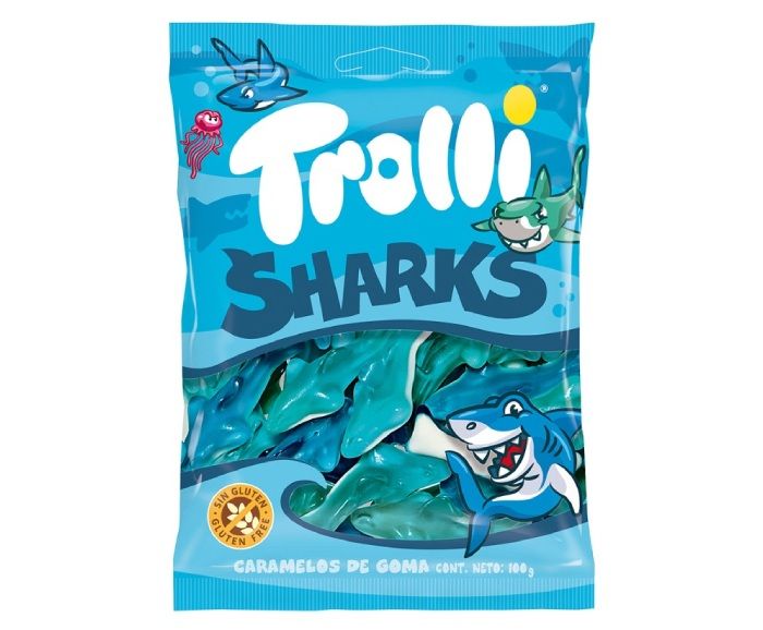 Забавни желирани бонбони с форма на акули. Не съдържат глутен.