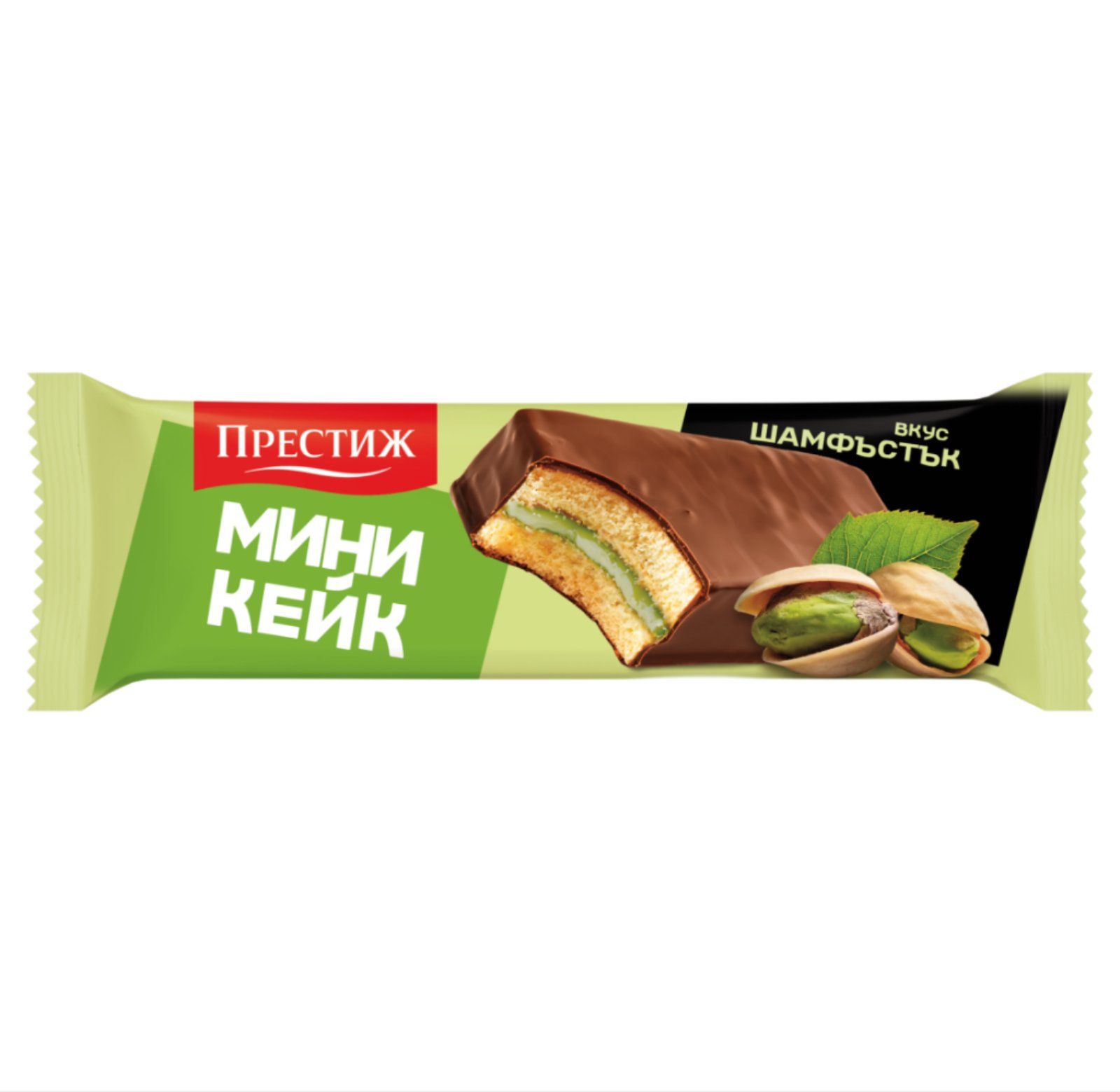 Престиж Мини Кейк с вкус на шамфъстък. Това е десерт тип суха паста, който е част от сравнително нова серия на българския производител „Престиж-96“.