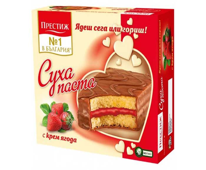 захар, питейна вода, пшенично брашно, сироп от глюкоза, частично хидрогенирани растителни мазнини (мазнини- палмова, соева, рапична, слъчногледова, емулгатори- сорбитан, тристеарат, соев лецитин), нехидрогенирани растителни мазнини (мазнини-палмова, ший, емулгатори - моно и диглицериди на мастни киселини, соев лецитин, ароматизант), влагозадържащи агенти (глицерин, сорбитол), суроватка на прах, плодов пълнеж ягода- 2,3% (ягоди- 0,8%, глюкозо-фруткозен сироп, захар, сгъстител- нишесте, стабилизатор- натриева карбоксиметилцелулоза регулатор на киселинността- лимонена киселина, консервант- калиев сорбат, растителен ароматизант, натурален оцветител- антоцианини), пастьоризиран яйчен меланж, обезмаслено мляко на прах, какао на прах с намалено маслено съдържание, сол, набухватели (натриев бикарбонат, натриев кисел пирофосфат, монокалциев фосфат), регулатор на киселинността (лимонена киселина), консервант (калиев сорбат), оцветители (бета каротин, бетанин), емулгатори (рапичен лецитин, моно и диглицериди на мастни киселини, пропилен гликол естери на мастни киселини, полиглицерол полирицинолеат, гума ксантан), етанол, царевично нишесе, ягодов ароматизант. Може да съдържа следи от фъстъци, сусамово семе и ядки (лешници, орехи, пеканови ядки).
