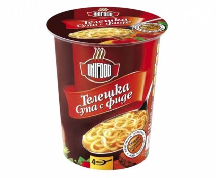 Готова супа с фиде в чаша "Уни-Фуд". Иновативен продукт за тези, които бързат. Сипват се 400 мл. вряща вода в чашата и се изчаква 4 минути. Супата е готова.