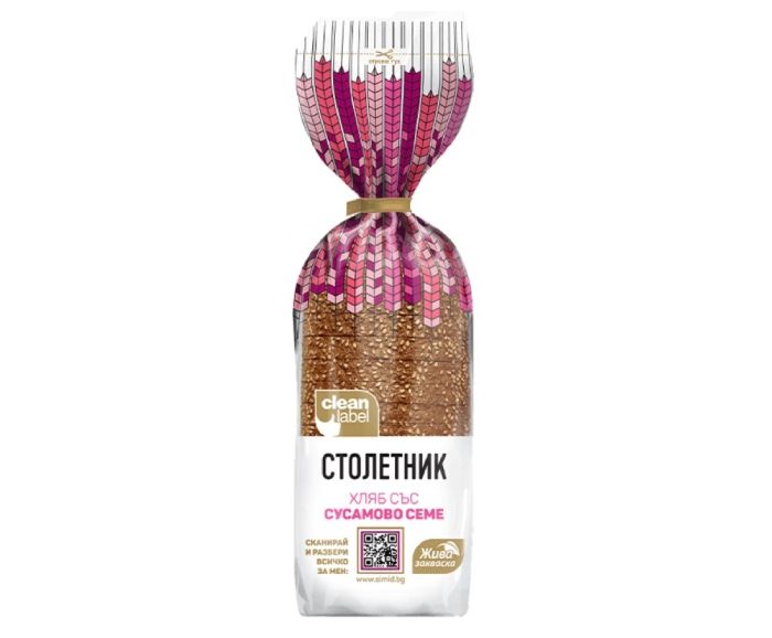 24% Пшенично брашно "Типово", 16 % пшенично брашно "Добруджа", 13% пълнозърнесто пшенично брашно, вода, течна жива закваска ( вода, ръжено брашно) 10%, фини пшенични трици 6%, трапезна сол, поръска (сусамово семе 2.5%), хлебна мая