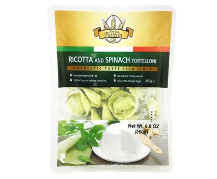 грис от твърда пшеница, яйца от свободно отглеждани кокошки, 12%, сирене Рикота (суроватка, мляко, сол), спанак 9,8%, хлебни трохи (пшенично брашно, вода, сол), слънчогледово олио, суроватка, сирене Моцарела (мляко, закваска, сол), сирене Грана Падано, картофени стърготини, фибри, сол, екстракт от мая, индийско орехче. Съдържа: глутен, яйца, мляко.