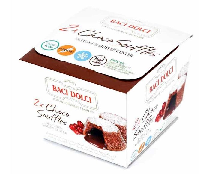 Яйчен меланж, подсладител; малтитол, шоколадов кувертюр 17% (какаова маса, подсладител; малтитол, какаово масло, емулгатор; соев лецитин, ароматизант), краве масло от мляко, оризово брашно, царевично брашно, яйчен жълтък, какао на прах.