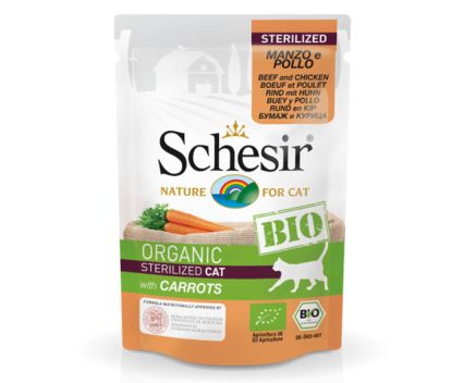 Био храна за кастрирани котки с пилешко месо, говеждо и моркови Schesir BIO 85 гр