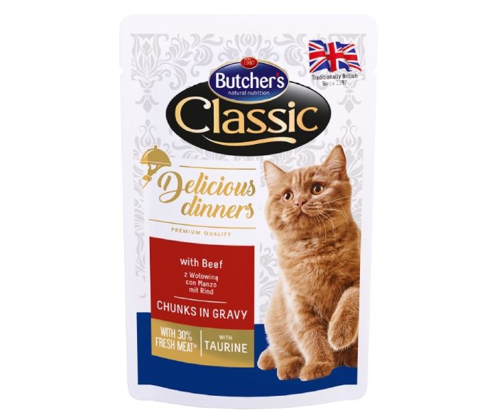 Месо и странични животински продукти (40%, от които говеждо месо 25%, прясно месо 30%*), минерали. Естествени съставки минимум 99%**, добавки (на кг): хранителни добавки: таурин: 300 mg; витамини: витамин A: 2000 IU, витамин D3: 300 IU, микроелементи (mg/kg): цинков оксид: 5; манганов сулфат монохидрат: 4; меден сулфат пентахидрат: 5, аналитични съставки (%): протеин 8,5; сурови влакнини 1,0; съдържание на мазнини 6,0; сурова пепел 2,0; влага 81,0
