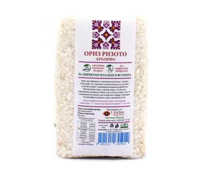 Ориз Арборио от най-високо качество, отгледан в България, по поречието на река Марица, по напълно естествен начин с минимална механична обработка. Перлено бели, меки и кръгли зърна, с по-високо съдържание на нишесте. Вари се до степен ал денте, така че сърцевината на зърното да остане леко твърда. Подходящ за приготвяне на ризото, супи и ароматни ястия.