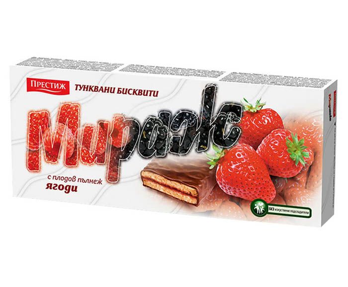 пшенично брашно, сладко от ягоди- 23% (ягоди-8%, глюкозо-фруктозен сироп, захар, желиращ агент- пектин, регулатор на киселинност-лимонена киселина, консервант- калиев сорбат, ароматизанти, натурален оцветител- антоцианини), захар, нехидрогенирани растителни мазнини (мазнини- палмова и ший; емулгатор- моно и диглицериди на мастни киселини, ароматизант, оцветител- бета каротин), частично хидрогенирани растителни мазнини (мазнини- палмова, соева, рапична, слънчогледова, емулгатори- сорбитан тристеарат и соев лецитин), какао на прах с намалено маслено съдържание, регулатор на киселинността- лимонена киселина, обезмаслено мляко на прах, суроватка на прах, пшенично малцово брашно, царевично нишесте, пастьоризиран яйчен меланж, набухватели (натриев бикарбонат, амониев бикарбонат), сол, емулгатори (рапичен лецитин, амониеви фосфатиди), ароматизант.