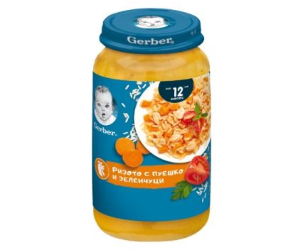 Nestlé GERBER ® Junior Ризото с пуешко и зеленчуци е предназначено за малки деца след 12-и месец. Продуктът е с подходяща за възрастта консистенция, съдържаща по-големи твърди парченца, като се доближава до вкуса на храната за възрастни, но с високите изисквания и контрол, които се спазват при бебешките храни. Това е пюре, което осигурява необходимите хранителни вещества белтъци, въглехидрати и мазнини и е подходящо за деца, в чийто меню са въведени твърди храни. Съдържанието на моркови, лук както и ситно нарязан магданоз и риган обогатяват вкусовия свят на детето и допринасят за изграждането на здравословни хранителни навици. Комбинацията от пуешко месо и зеленчуци е чудесна, защото помага за изграждането на балансиранo меню на малкото дете.
