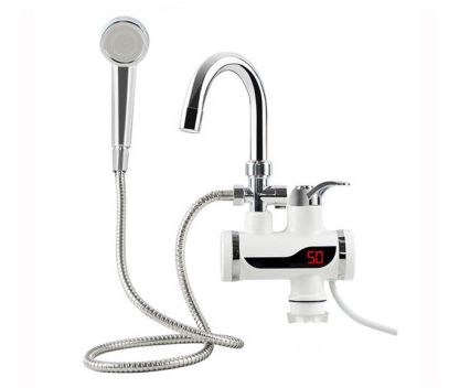 Смесителна батерия с вграден проточен бойлер за вертикален монтаж и подвижен душ.