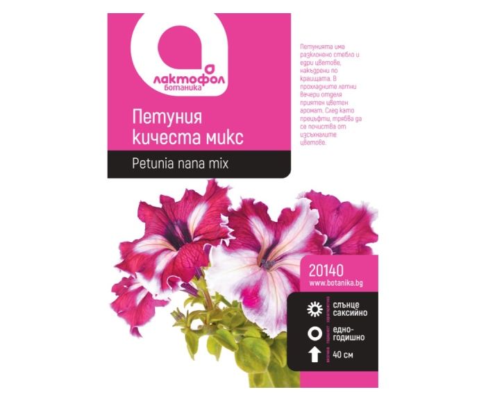 Петунията е с ниски, гъсти стъбла и едри цветове. Вирее добре на слънчеви места и изисква редовно поливане. Размножава се през февруари-март чрез семена. Петунията с нейното разнообразие от цветове, форми, багри, обилен и продължителен цъфтеж е сред най-популярните градински растения.