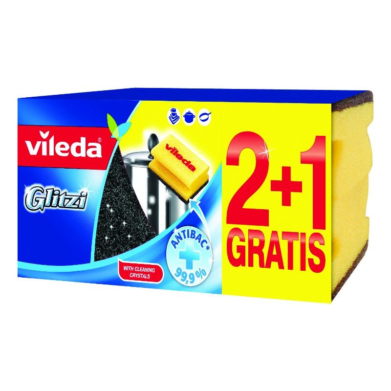 Кухненската гъба Glitzi на Vileda е със сребърни кристали, които гарантират антибактериален ефект, като не позволяват на бактериите да залепват на повърхността. Твърдият абразив почиства лесно и бързо и по-упоритите петна без да надрасква повърхностите.